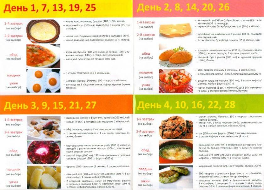 | Среда | Завтрак: 2 яйца всмятку, тост, черный чай. Второй завтрак: 100 г. творога с изюмом, кофе из цикория.