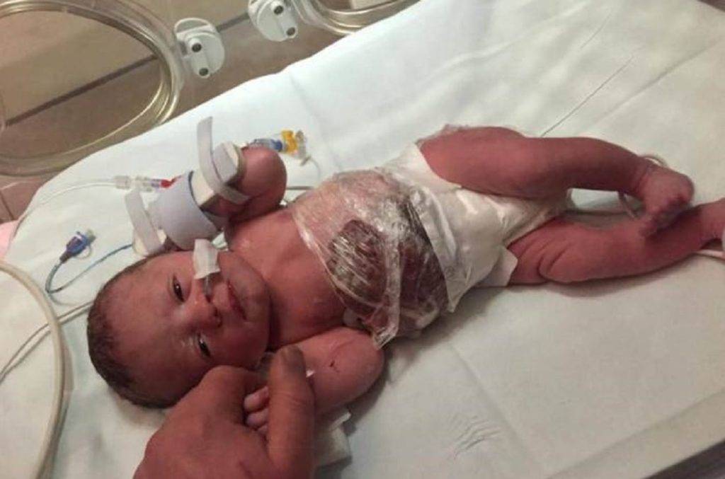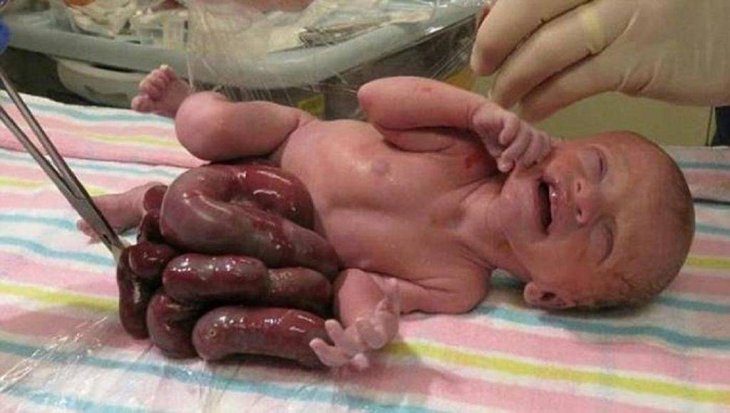 - живот младенца не имеет достаточного места для удержания всего кишечника.