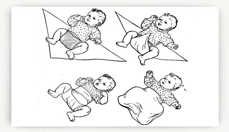 - Положите ребенка на пеленку, сложенную треугольником. Ее верхняя граница должна находиться на уровне поясницы или немного выше.