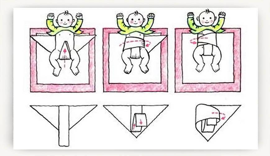 Пеленку следует разложить прямоугольником, положив ребенка в центр. Затем нужно поочередно обмотать его каждым краем пеленки, левым и правым. Низ подвернуть и зафиксировать сзади, под коленками. Для наглядности посмотрите, как это происходит, пошагово с картинками.
