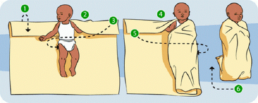 Данный способ также позволяет малышу свободно двигать конечностями, но при этом препятствует вздрагиваниям и пробуждению.