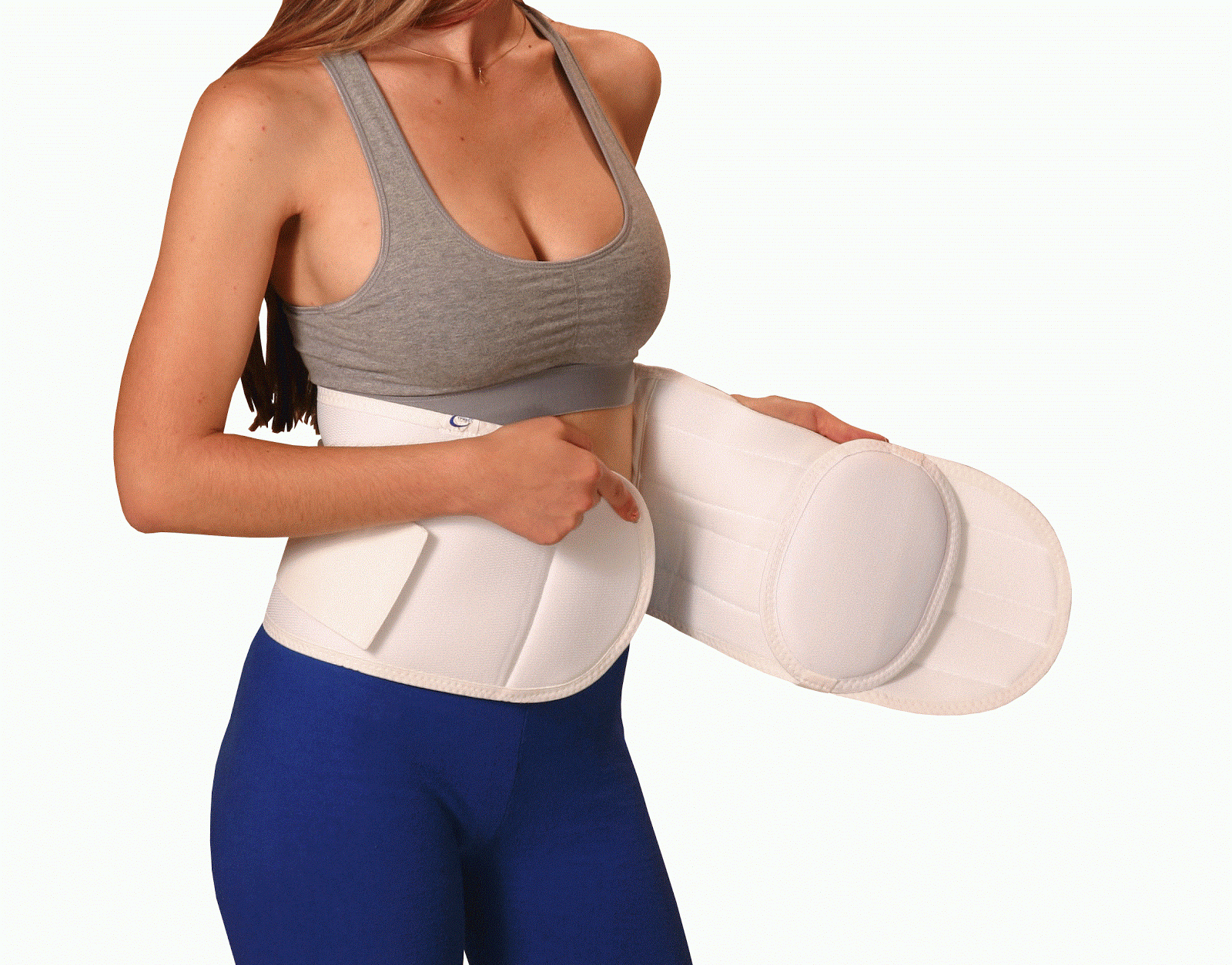 Универсальный бандаж-пояс. Является самой популярной и практичной моделью, которую выбирают будущие мамочки. Представляет собой эластичную ленту, которая состоит из узкой и широкой части, каждая часть регулируется с помощью липучек. Универсальность пояса в том, что использовать его можно как во время беременности, так и после рождения малыша. Во время беременности пояс фиксируют широкой частью на поясницу, распределяя нагрузку со спины, а узкой частью фиксируются низ живота. После родов пояс носят наоборот: широкая часть держит мышцы живота, а узкая – фиксирует спину. Поддерживающий пояс надевают на нижнее белье летом, колготки или брюки в зимний период. Некоторые производители выпускают перфорированные пояса, благодаря отверстиям в материале бандаж-пояс позволяет коже дышать, в нем не так жарко летом. Данный вид бандажа идеально подходит женщинам, которые стремительно набирают вес и предрасположены к растяжкам. Кроме того, модель очень доступна, так имеет низкую стоимость.