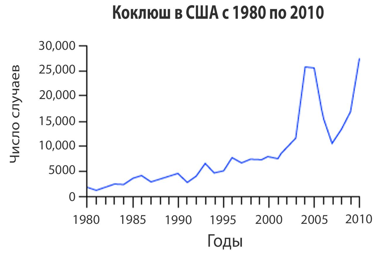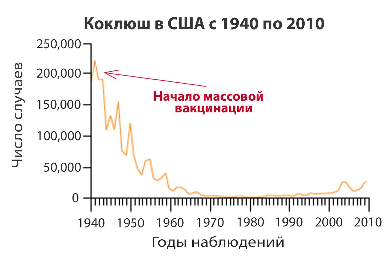 - После внедрения массовой вакцинации заболеваемость коклюшем составила 1 на 100 000 населения