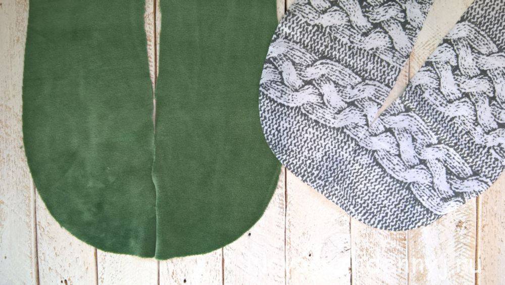 Вырежьте 2 одинаковых детали из ткани. Не забудьте, что маленькие отступы в 2 см, которые мы делали ранее, прострачивать не надо, чтобы позже можно было вставить в них завязки