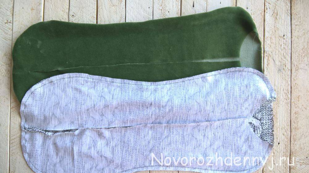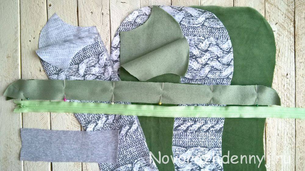 - Из рибаны выкроите прямоугольник высотой 5 см и длиной 15 см. Сразу можете согнуть его вдоль изнанкой внутрь и загладить утюгом. Из подкладочной ткани выкроите одну деталь спинки и две полочки. А из основной ткани – одну деталь спинки, две полочки и две закругленные на концах детали планки, которая будет закрывать молнию внутри кокона. Планка должна быть шире молнии, а по длине ее нужно сделать суть короче внутреннего края полочек. Детали планки сложите вместе лицевыми сторонами внутрь и скрепите портняжными булавками.