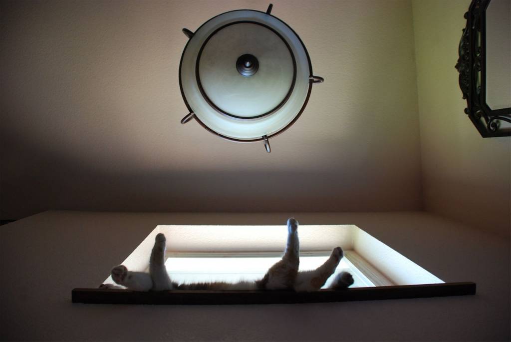 Не менее привлекательно и искусственное освещение. Многие коты любят прилуниться под настольной лампой. В отличие от торшера и люстры, она позволяет максимально приблизиться к источнику тепла.