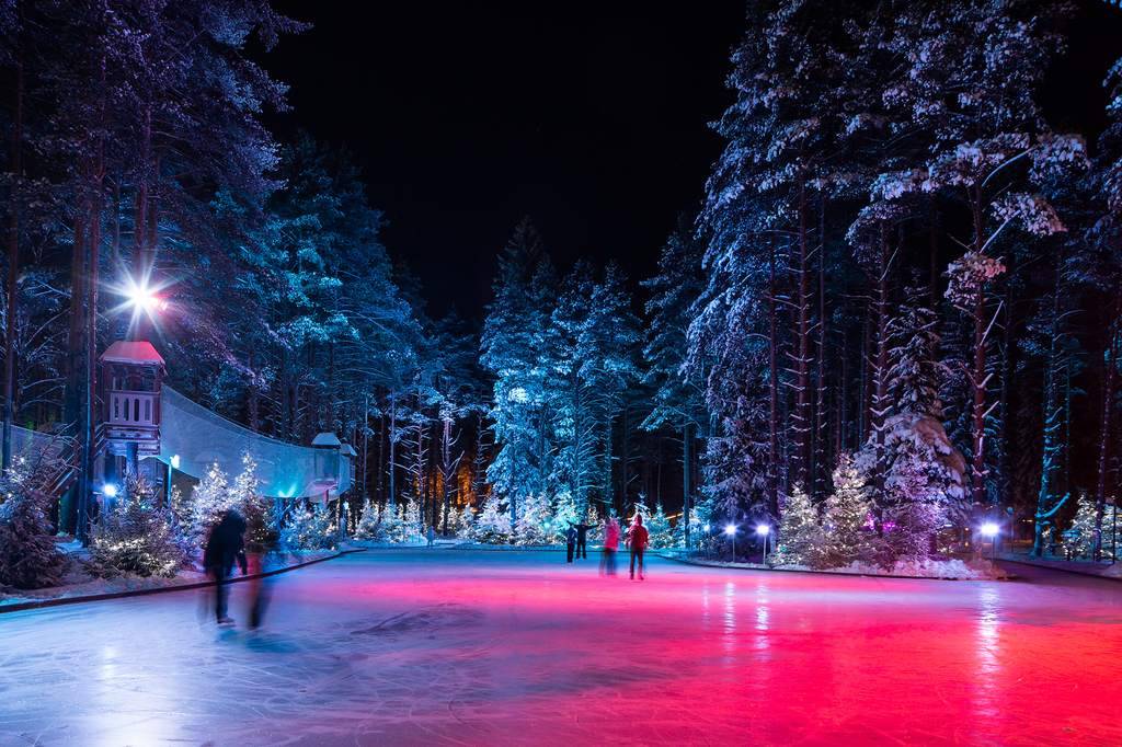 Каток, расположенный в живописном лесу, у истоков реки Охта, имеет большую протяженность. Прекрасное освещение, уютные домики с ароматным чаем, прокат ватрушек – все это дает возможность активно и весело провести время с детьми.