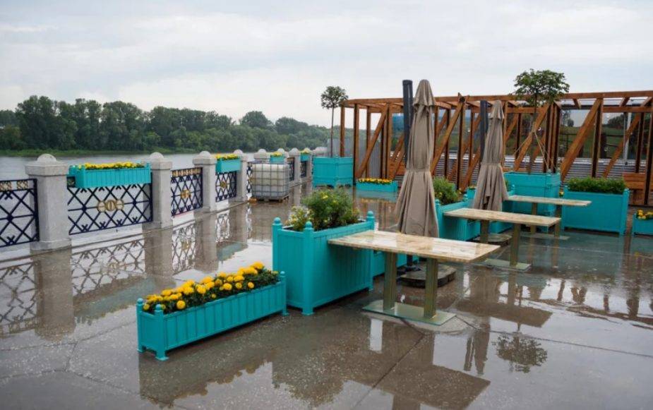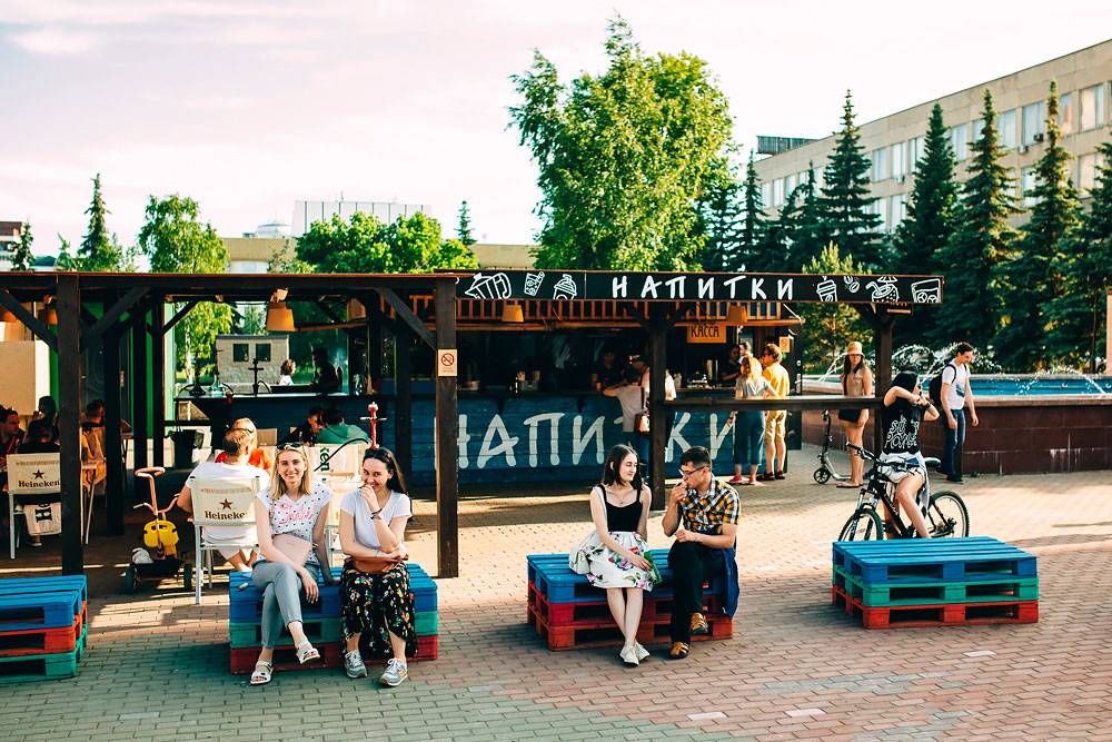 На площади Двух фонтанов установлены 4 павильона, которые работают в популярном формате уличной еды и летнего кафе. Здесь готовят блюда азиатской и европейской кухни, продают напитки и десерты. В павильонах можно попробовать кыстыбый – традиционные башкирские лепешки с начинкой, фирменные чебуреки и кутабы.