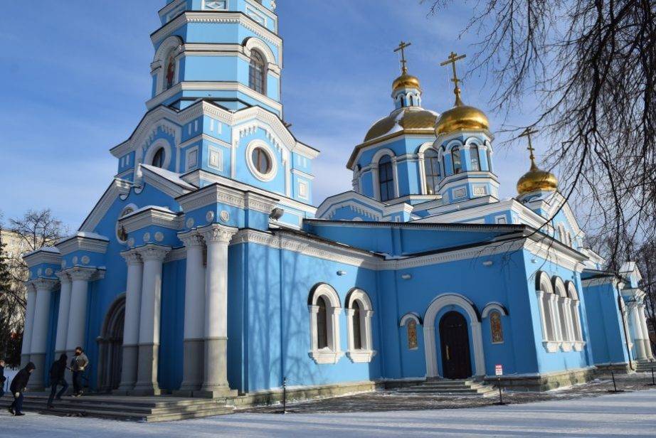 Наверное я буду права, если назову это здание небесно — голубого цвета с золотыми куполами самым красивым в Уфе. На его колокольне работают восемь колоколов, а внутреннее убранство храма не менее поражает — богатая роспись стен и потолков, а в отделке использованы материалы завезенные с Италии, Южной Африки, Пакистана и Греции. Здание храма пережило много трудностей и не сразу стало местом священнослужения. В революционное время его стенах размещался госпиталь, потом кинотеатр, была уничтожена купольная часть и наполовину снесены опорные столбы, и только в советское время храм вернули православной церкви и восстановили.