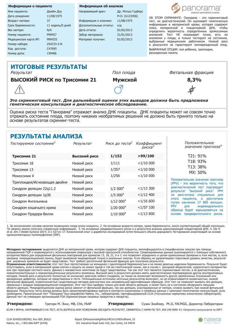 Результат «высокий риск»: У вашего ребенка высокий риск данного состояния. Инвазивное тестирование во время беременности, такое как амниоцентез или биопсия ворсин хориона, либо тестирование после рождения ребенка дадут окончательный результат о наличии либо отсутствии у ребенка данного состояния.