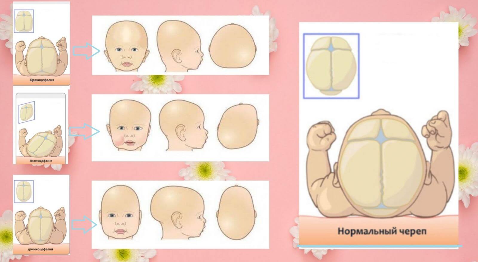 Младенцы, появившиеся на свет естественным способом, могут иметь голову заостренной или конусовидной формы, круглую с выпуклыми лобными буграми (брахицефальную), овально-вытянутую (долихоцефальную), уплощенную, иногда с отеком или гематомой (кефалогематомой). Все это варианты нормы.