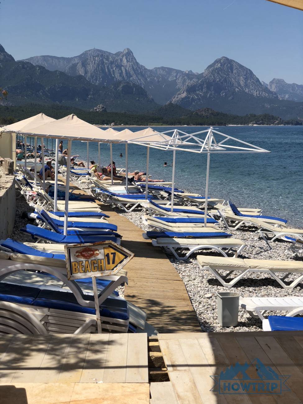 Отель расположен на первой линии и имеет свой частный пляж. Каждый год в зоне с шезлонгами насыпают песок. А вход в воду — галечный. Его регулярно чистят, но могут попадаться крупные камни. Вода здесь очень чистая и прозрачная.