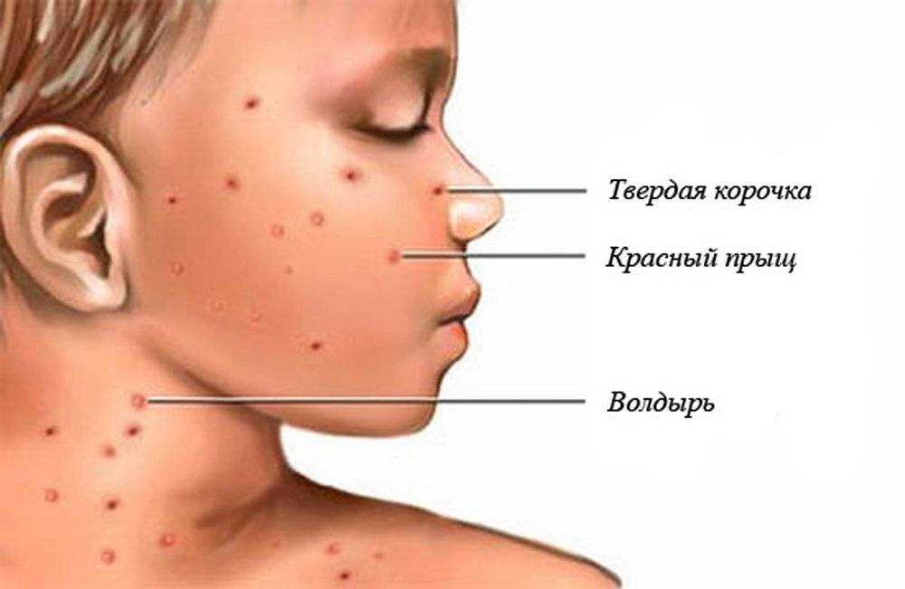 Первично на коже видна только сыпь, по внешним признакам похожая на потничку. Затем становятся видны характерные небольшие пятна, на месте которых образуются пузырьки с прозрачным содержимым – везикул. Вокруг пузырька всегда есть небольшая каемка – гиперемический ореол. Спустя несколько часов жидкость в пузырьке мутнеет, а еще позднее пузырек лопается, и жидкость из него начинает вытекать. Если везикул не трогать, то через два-три дня он начинает подсыхать. Плотная корочка образуется от центра к краям пузырька, и после полного отсыхания корочки кожа остается розовой, но без рубцов, гладкой на ощупь. Если ребенок активно чешет высыпания, могут образоваться вмятинки, как после прививки БЦЖ.
