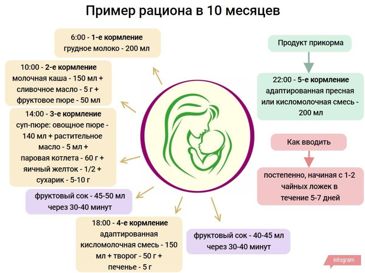 В этом период грудное молоко должно составлять 25-30 % суточного объема пищи. Перерыв между приемами еды в 10 месяцев должен быть около 4 часов. Сама пища – максимально многообразна, поскольку от нее зависит развитие ребенка.