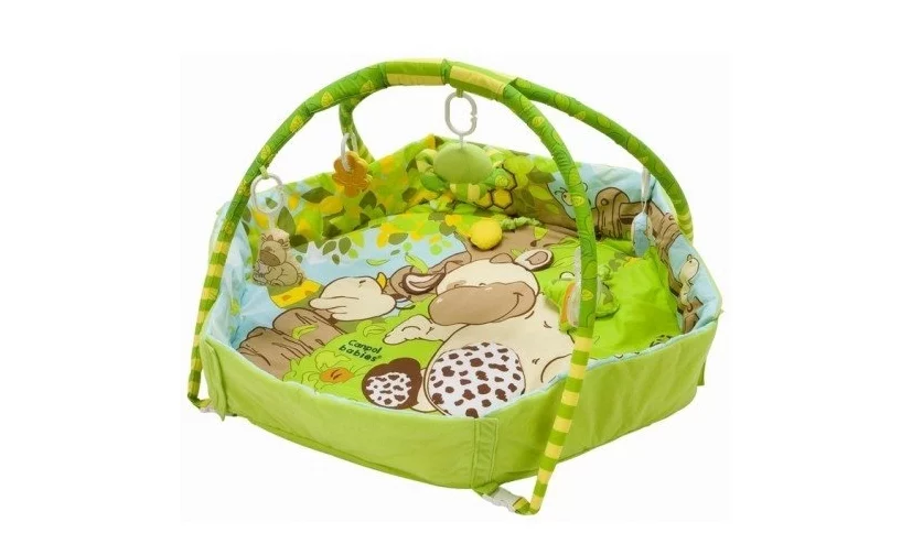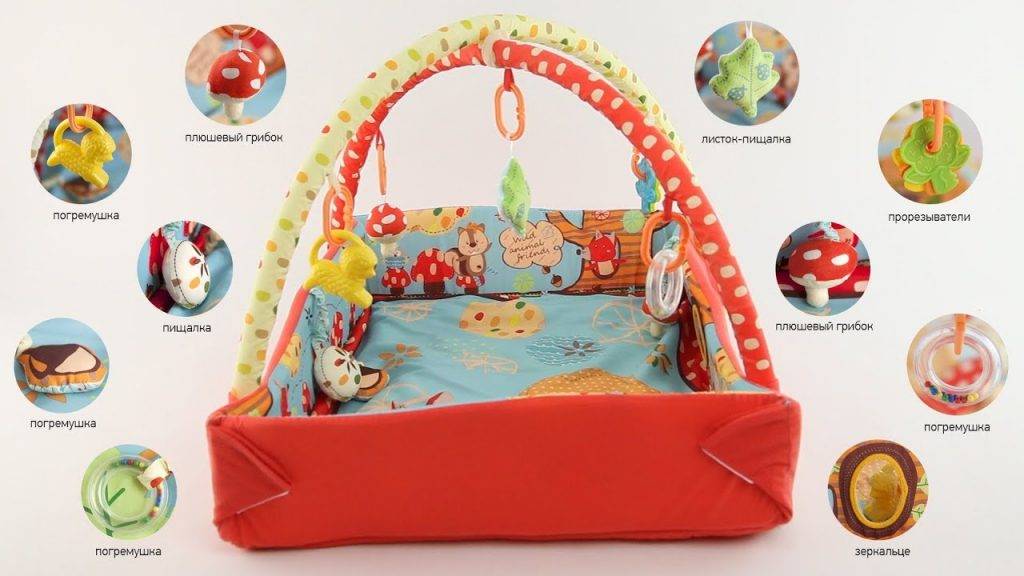 Бортики и дуги.Бортики нужны для предотвращения скатывания малыша за пределы гаджета, должны быть мягкими и упругими. Дуги нужны для закрепления погремушек и шуршалок, должны быть сделаны из прочного пластика и легко крепиться к РК. К ним можно прикрепить пищалки, безопасные зеркала, интерактивные и мягкие игрушки с шуршащей бумагой внутри и даже видеоняню, если Вам нужно куда-то отлучиться.