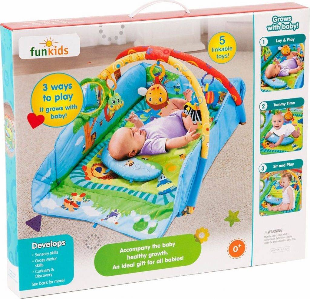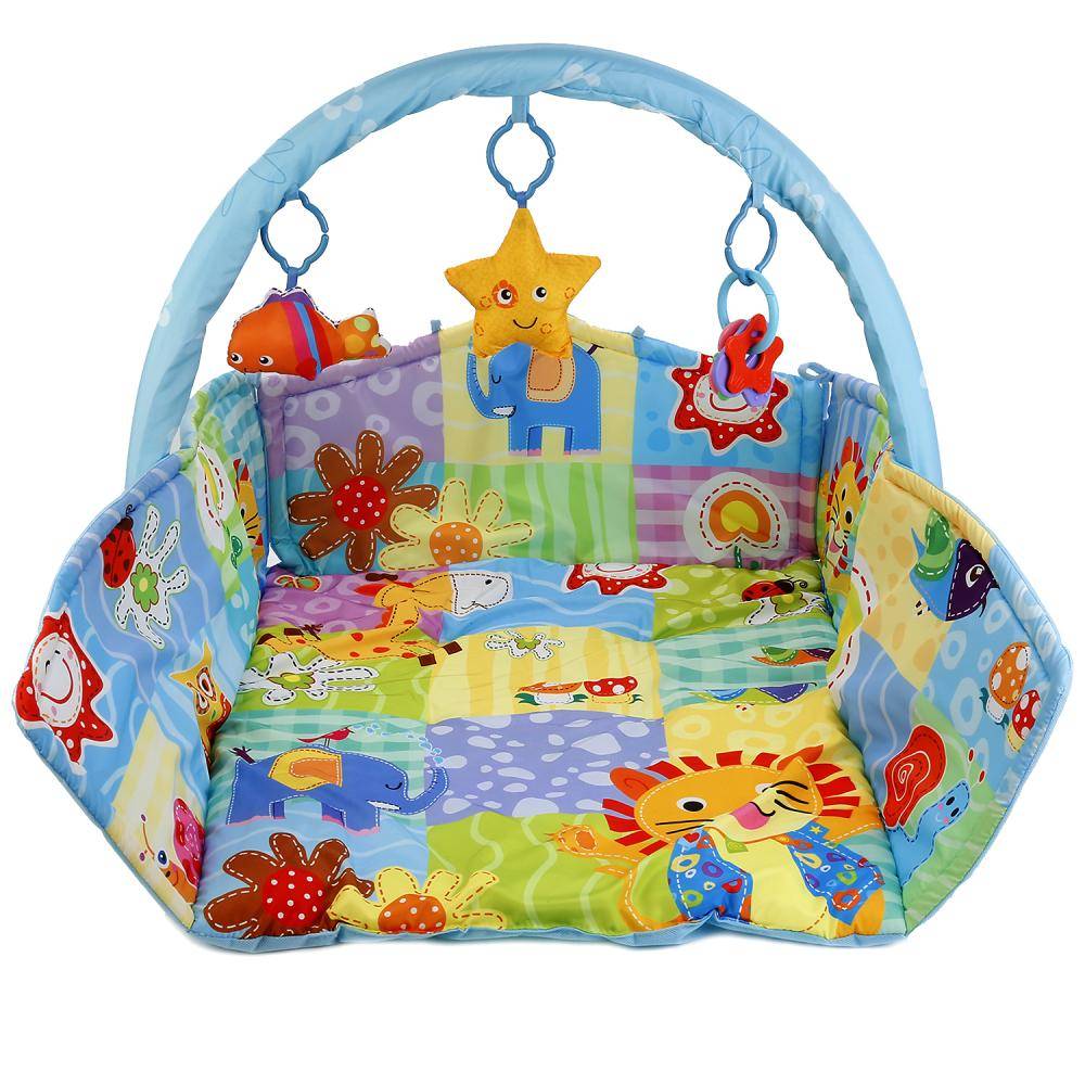 Детский коврик, оснащенный бортиками и дугой. В комплекте имеется 3 подвесные игрушки. Яркие картинки на текстиле понравятся детям как с первых месяцев жизни, так и постарше