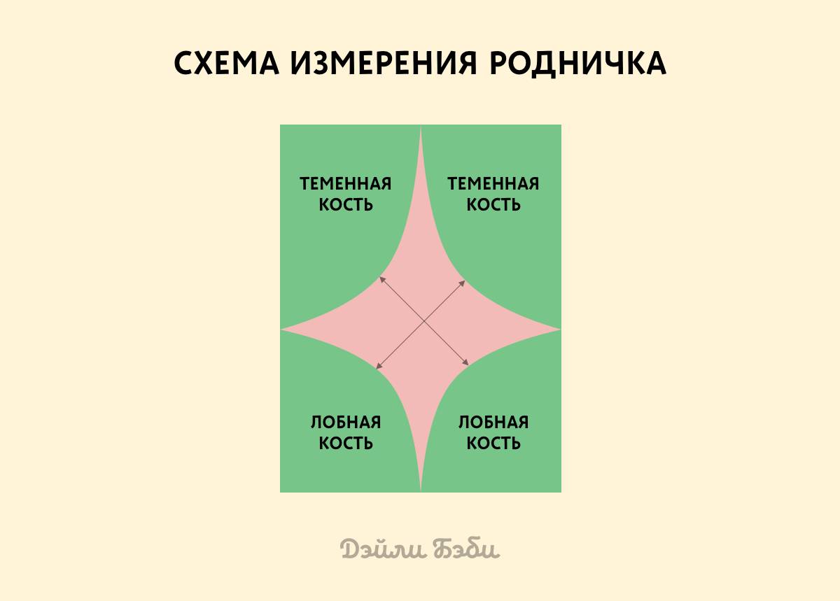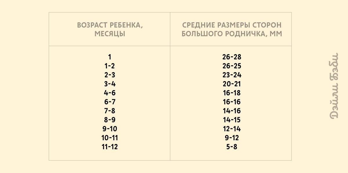 Сами определения «маленький» и «большой» условны по отношению к родничку. Узнать, каким он должен быть в норме, можно ориентируясь на очень приблизительные цифры, которые приведены в таблице. Чтобы измерить родничок, возьмите сантиметровую ленту и посмотрите расстояние между противоположными сторонами «ромба».