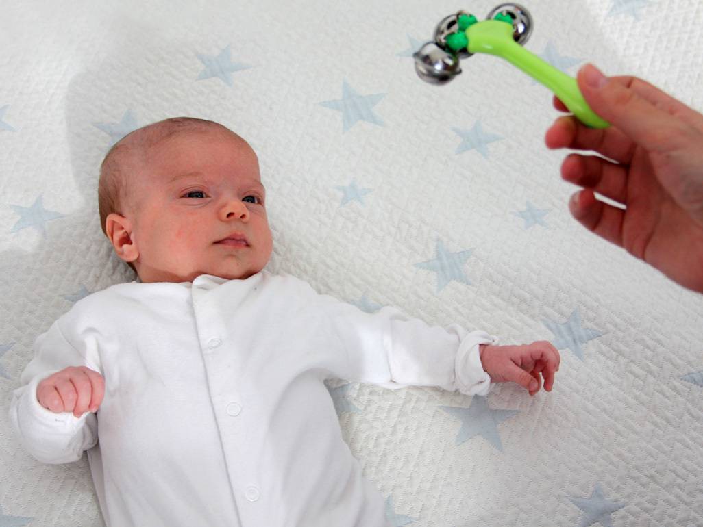 Максимальное время бодрствования между снами – от 15-40 минут в первую неделю до 60 минут в последующие. В это время малыша можно занимать потешками, массажем, купанием и другими процедурами согласно распорядку дня. Особый интерес детки проявляют к подвешенным предметам и черно-белым погремушкам, картинкам.