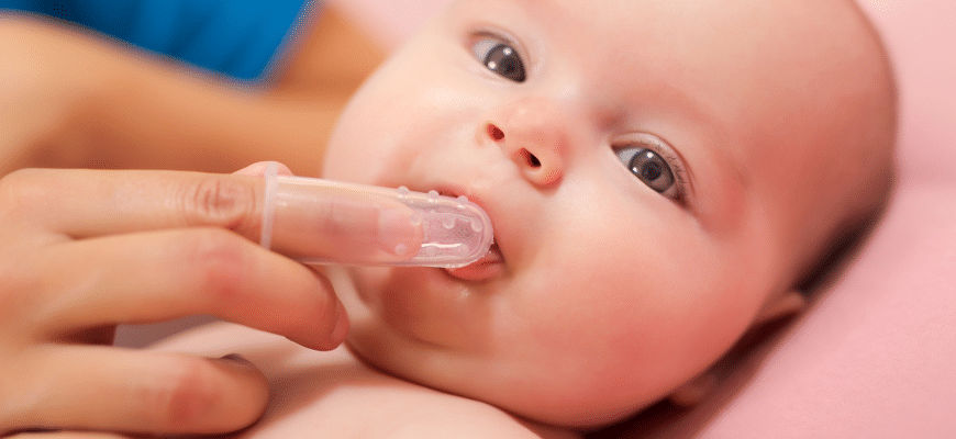 В аптеке можно приобрести специальный силиконовый колпачок, у которого на одной стороне тонкие щетки, а на другой толстые. Данный аксессуар применяют как массажер для десен. После того как появятся молочные зубы, им можно выполнять гигиену полости рта. Посоветуйтесь с педиатром, какой стоматологический гель можно использовать. Хорошо зарекомендовали себя подобные средства: