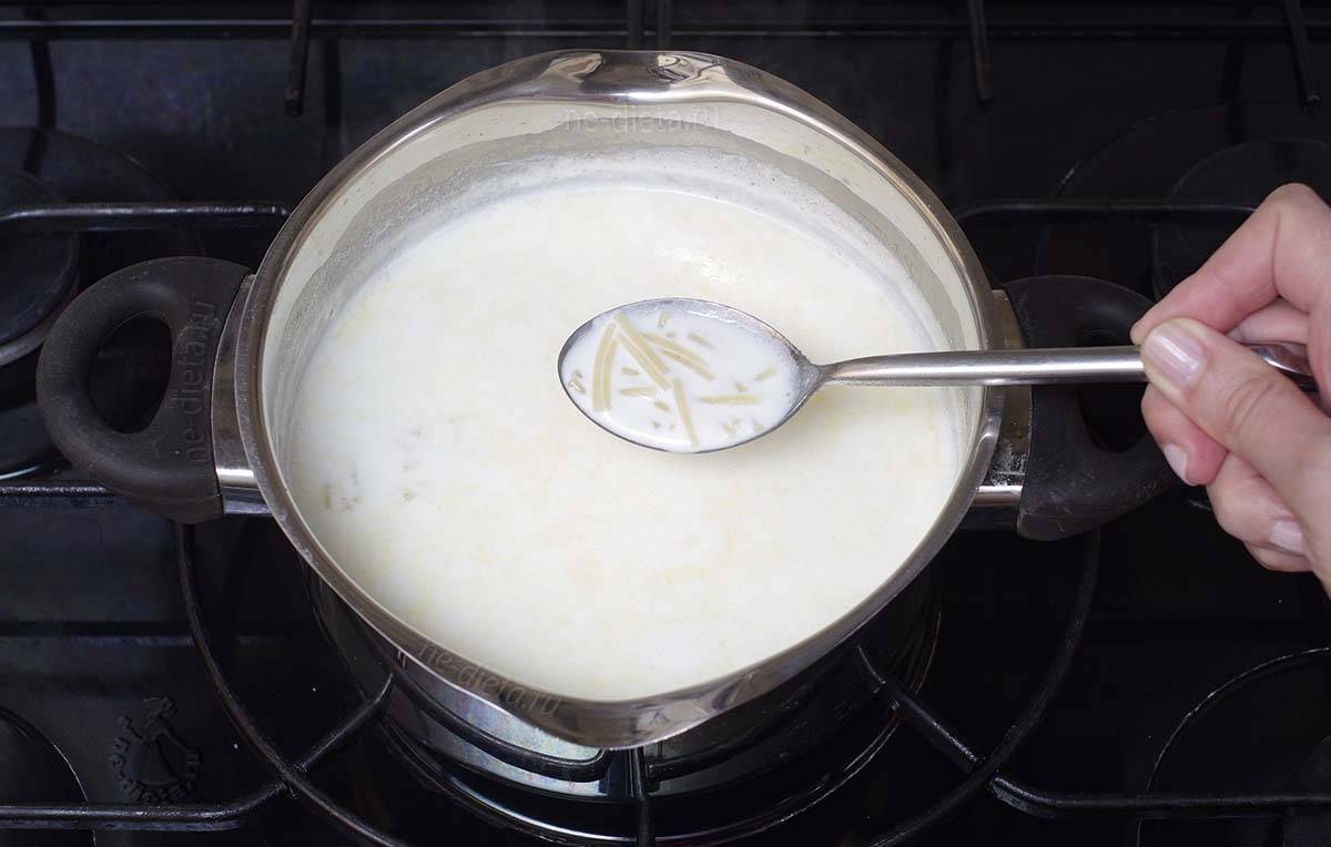 Варить молочный суп на маленьком огне при небольшом кипении в течение 5 — 7 минут до готовности вермишели. Готовый суп закрыть крышкой и перед подачей дать ему настояться в течение 10 — 15 минут.