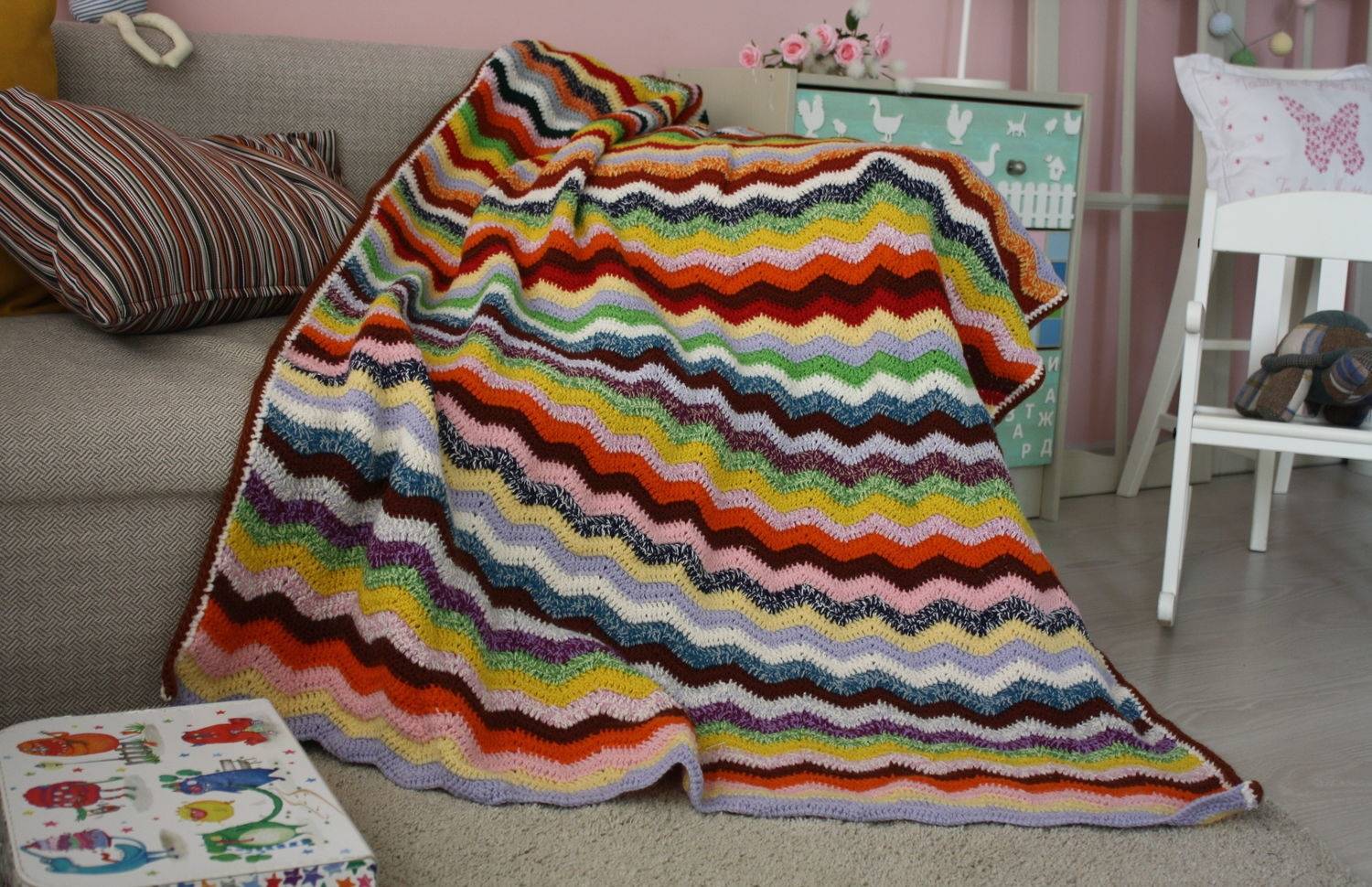 Чтобы плед был теплым, его вяжут из шерстяных или полушерстяных ниток. Для ребенка важен деликатный уход и отношение