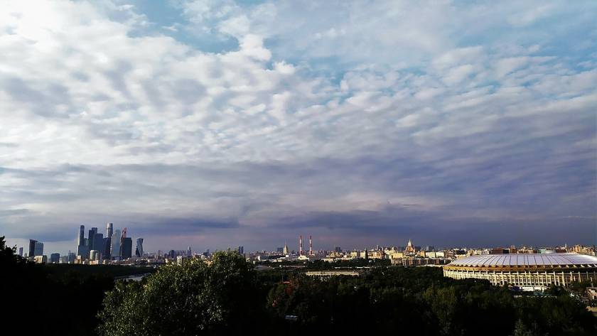 Вид сверху на Москва-реку. С Воробьевых гор вид летом не столь потрясающий, как в другие сезоны — листва деревьев заслоняет. Позади — сталинская высотка, главный корпус МГУ. Если школьник увлекается блогерами, то узнает у выхода с канатки заведение «Шаурму хачу» от популярного блогера, задавшего вопрос о шаурме президенту.
