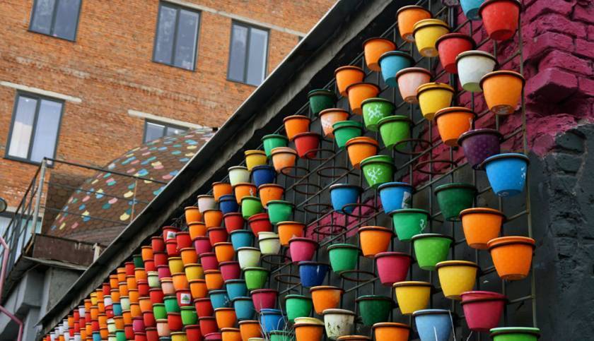 Стены расписаны граффити, на улице арт-инсталляции. В здании офисы также расписаны и украшены по-своему, можно пройтись по этажам и всюду заглянуть. Здесь снимают офисы творческие люди — например, собраться и поиграть на гитарах с друзьями. Проводятся мини-концерты звезд, типа «Машины времени». Сувенирные лавки, несколько мелких кафе — например, с мороженым в виде политиков или поэтов за 350 руб. Если заранее посмотреть афишу мероприятий, можно попасть на движуху. А в основном это место-для-пофоткать.