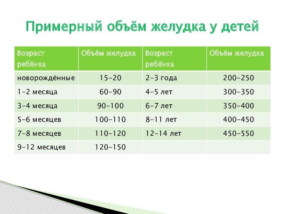 | Возраст | Количество кормлений | Объем одного кормления, мл |