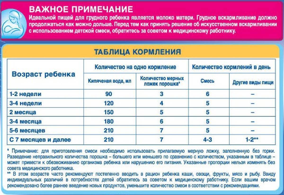 Разовое количество смеси, как правило, обсуждается с педиатром. Есть общие рекомендации, которые указаны в таблице.