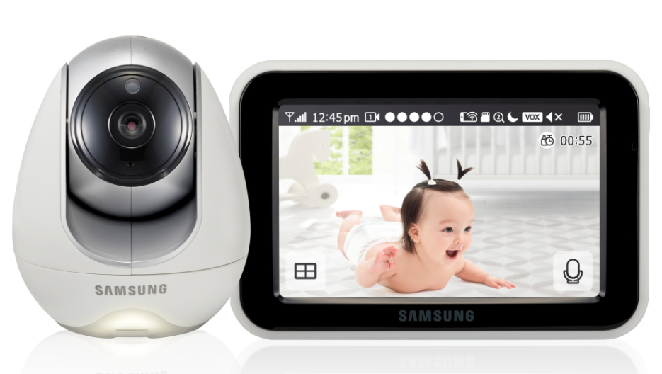 Видеоняня Samsung SEW-3057WP практичная и очень функциональная. Она контролирует температуру и влажность в комнате отдельным датчиком условий окружающей среды, а не расположенным на камере, который может нагреваться и искажать результат. Оповещения об изменениях в детской принимаются на родительский планшет и водящий в комплект Bluetooth -браслет с вибрацией. Подключить камеру можно по каналу Wi-Fi к смартфону iOS или Android через специальное приложение и наблюдать за ребенком (животным или престарелым человеком) из любой точки планеты. Правда, на смартфонах не работает звуковое уведомление об активности в комнате – только всплывающие сообщения, которые легко пропустить, однако такая связь видеоняни с родителями более стабильная и не зависит от количества стен и перекрытий в здании, которые приглушают сигнал. У родительского блока сенсорный дисплей 12,7 см (5 дюймов), работающий до 4 часов от зарядки до зарядки при включенном экране.