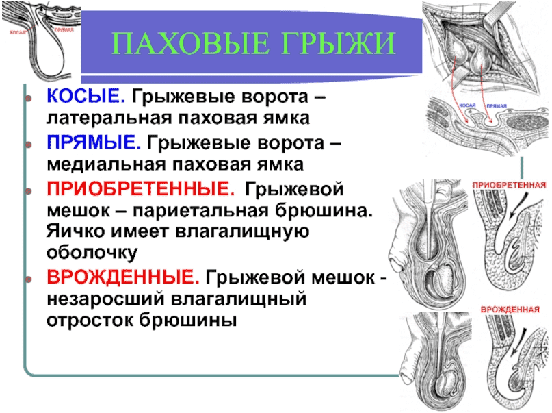 Паховые грыжи делятся на несколько видов и мест расположения- прямые, косые и комбинированные.